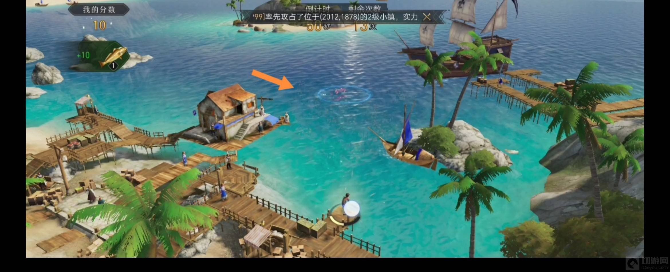 3、需要精准将渔网抛射到水面上有波纹的地方(这里才有鱼),鱼群出现的位置还是有迹可循的,如果鱼群出现在最远端,那么玩家朋友们直接蓄满力把网撒出去就能正中鱼群,如果鱼群在最近处的话,蓄力条大概在十分之一左右就撒网,这个时候近处的鱼群也能捕到。