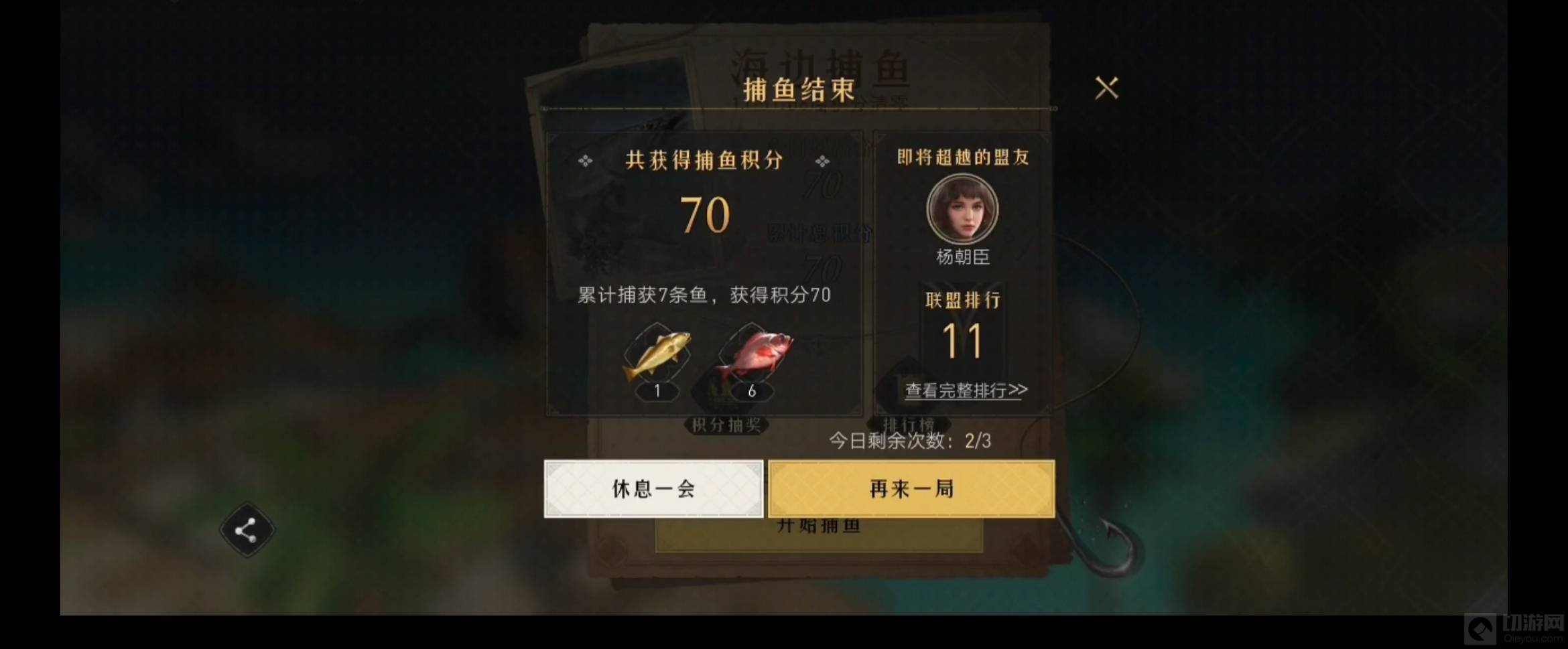 2、每个人有三次捕鱼的机会,每次捕鱼60秒钟的时间内可以撒15次网,长按屏幕蓄力,蓄力越久网撒的越远。