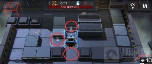 (1)先把所有箱子在红圈位置摆放完毕,在第一个狗到来前在1号位放置击杀回C先锋(例如翎羽、红豆)。