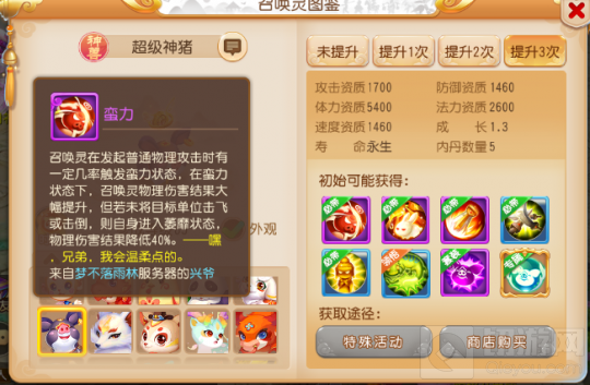 自带蛮力、高级神佑复生、高级必杀,提升3次后,1700攻击资质、1460防御资质、5400体力资质、1460速度资质,1.3成长,远超一般宠物。出色的资质、成长是神兽最主要的优势之一。