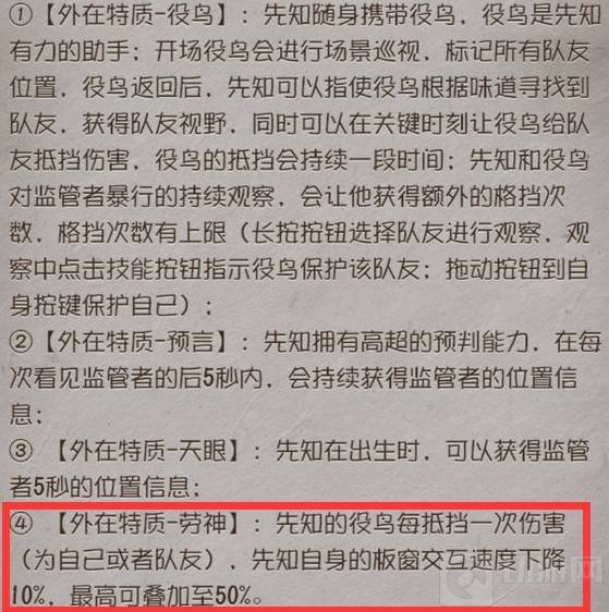 先知有外在特质劳神,交役鸟后会越来越羸弱,因此我们要尽量避免开局与监管者正面对抗最好苟起来破译密码机。虽然先知的辅助能力极强,不过技能使用也需要好的意识观和大局观。
