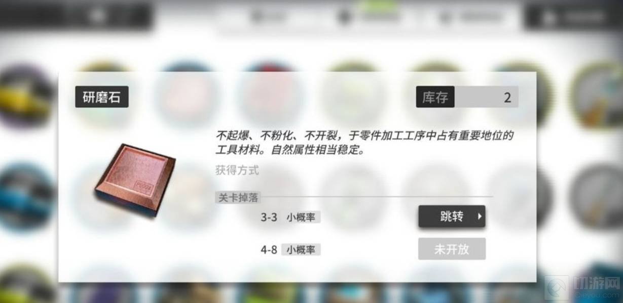 3.关卡奖励:进入仓库,点击研磨石,可以看到3-3和4-8通关小概率获得研磨石,3-3的掉落率大约28%,4-8的掉落率大约32%。