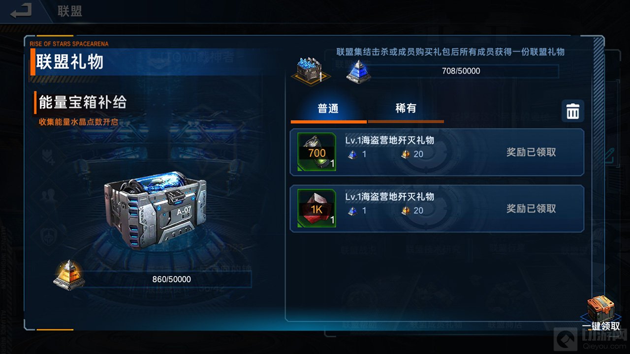 另外,联盟成员可以收集能量水晶点数开启能量宝箱补给。成员开启联盟礼物可以累积黄色能量水晶,当进度满后可领取宝箱补给,收集蓝色能量水晶可以提升宝箱等级,每10级宝箱品质随之提升。