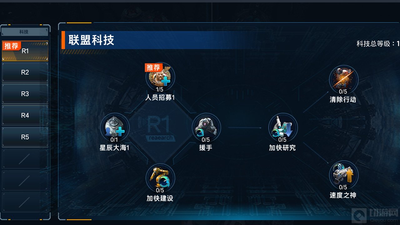 加入联盟的玩家都能够享受联盟科技的加成,联盟技术分为R1-R5五个级别,前置科技研究达到一定等级才可解锁下一级别科技研究。