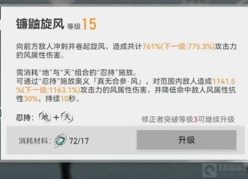 4、技能三:镰鼬旋风,向前方敌人冲刺井卷起旋风,对击中的敌人造成共计804.1%攻击力的风属性伤害。需消耗<天>与<地>组合的<忍持>释放。