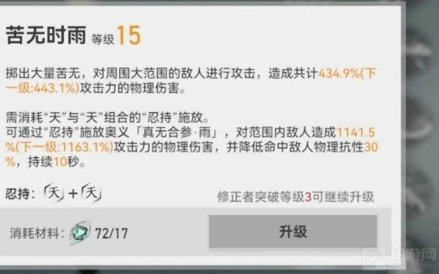 2、技能一:苦无时雨,掷出大量苦无,对周围大范围的敌人造成共计456.9%攻击力的物理伤害。需消耗<天>与<天>组合的<忍持>释放。