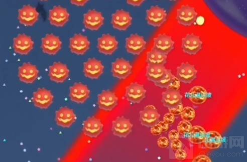 3、女巫会对玩家进行攻击,攻击方式就是如图裂开的红色小魔王和红色区域伤害,玩家需要通过闪合躲避攻击(玩法和普通模式类似,比红色小魔王大就能吃掉变大)。