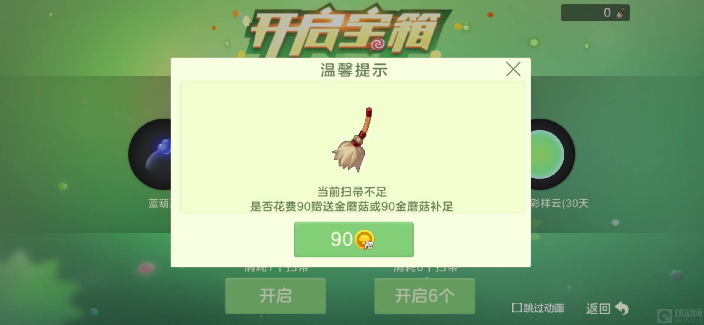 2、而扫帚需要花费90个赠送蘑菇才可以购买一个,有几个时光珍宝箱就买几个扫帚,当然个别需要多个扫帚。