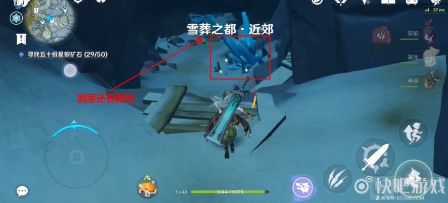 玩家传送到雪葬之都·近郊比较下面的那个传送点后,往左边方向走找到有水晶簇的山洞,洞口处就有一处矿点,全收下能拿到3块左右;再往洞里走还有两块矿石,可以再拿到2块星银矿石。