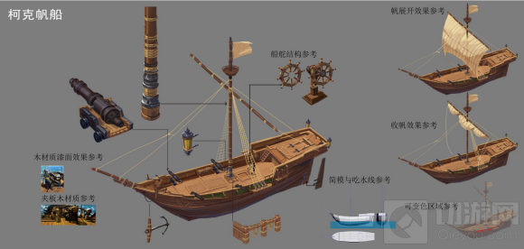 我们在为《黎明之海》中的船只设计原稿的时候,需要考虑的不仅仅是船只的功能,还有船只在真实的历史中所属的国家,船只外形特征等等方面。只有这样,船只才能充分展现出它在国度,功能以及制作上的特色。