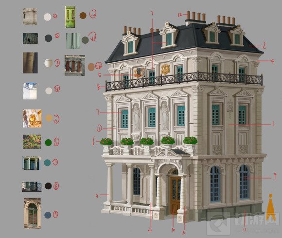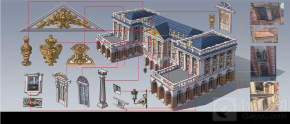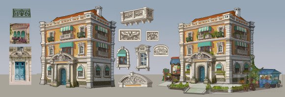 不过欧洲地区的建筑风格也不是千篇一律的,比如地中海附近的地区由于受文艺复兴的影响更多,装饰上更偏古罗马一些。再加上夏季炎热干燥,冬季温和多雨的地中海气候,他们的玻璃窗上一般都有遮挡布,当然这些内容都是我们后来对照地中海附近建筑的原图进行修改的。