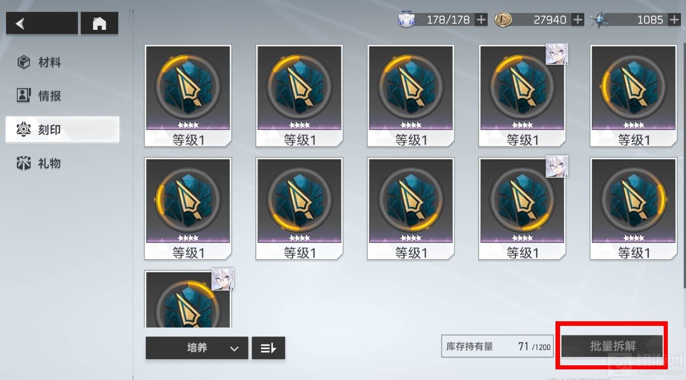 2、然后点击仓库-刻印,点击右下角的批量分解。