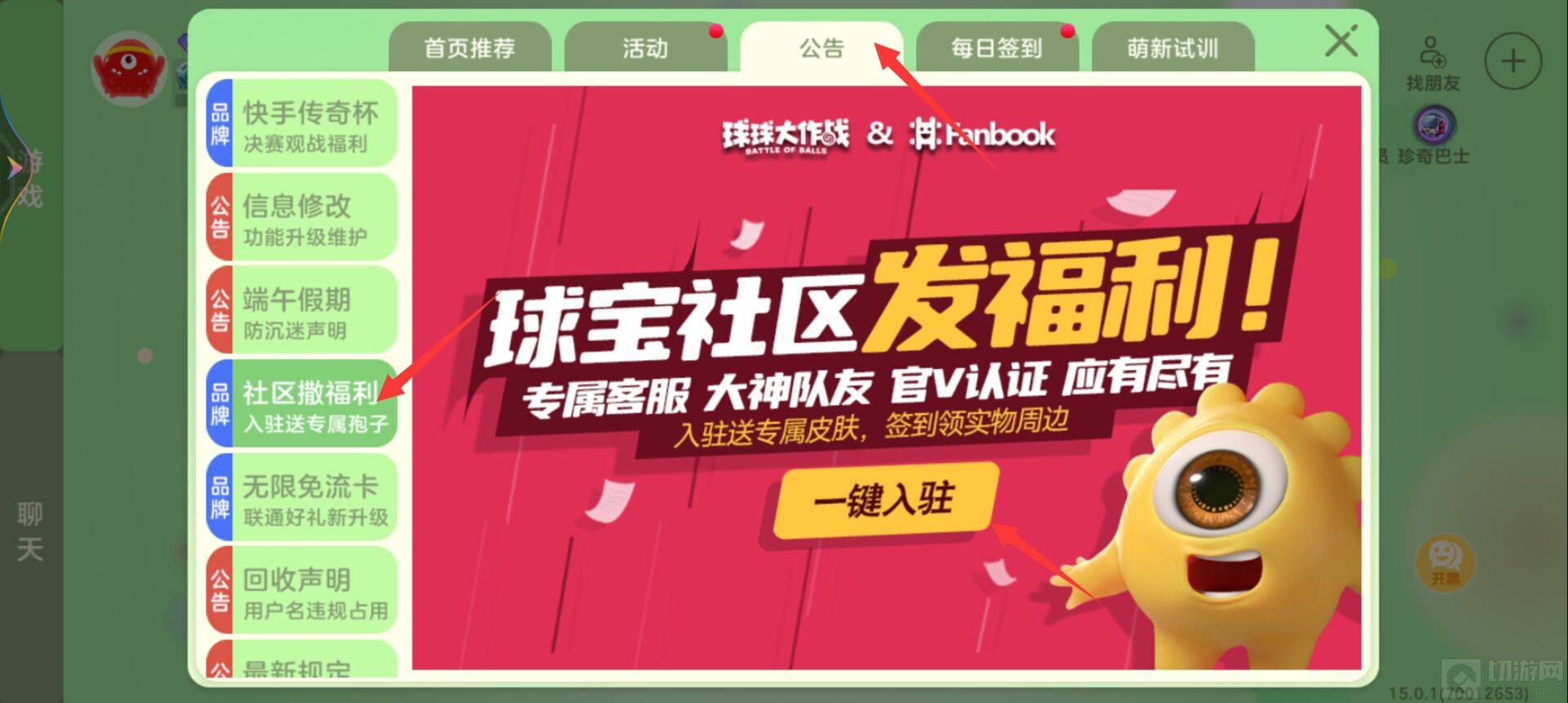 然后点击公告,选择社区撒福利,再点击一键入驻。