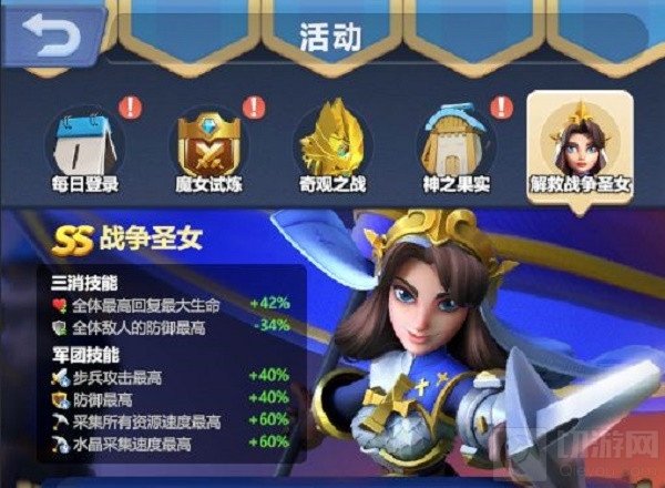 3、出征解救战争圣女,每次出征会解锁圣女囚车上的1条锁链,并且获得一份奖励,当3条锁链全部解锁时就可以成功解救圣女。