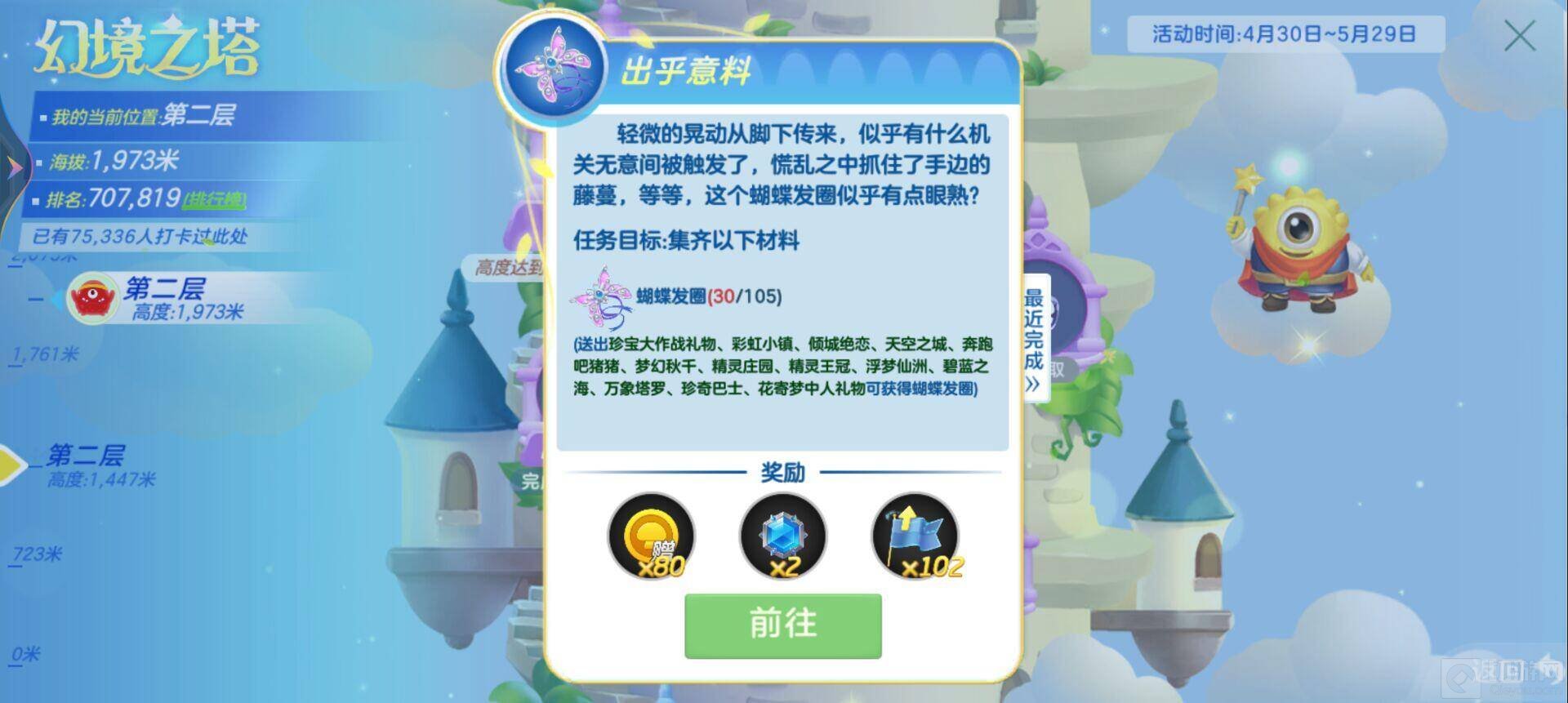这关需要收集105个蝴蝶发圈,当你送出珍宝大作战礼物,彩虹小镇,倾城绝恋,天空之城,奔跑吧猪猪,梦幻秋千,精灵庄园,精灵王冠,浮梦仙洲,碧蓝之海,万象塔罗,珍奇巴士,花寄梦中人礼物都可以获取蝴蝶发圈。