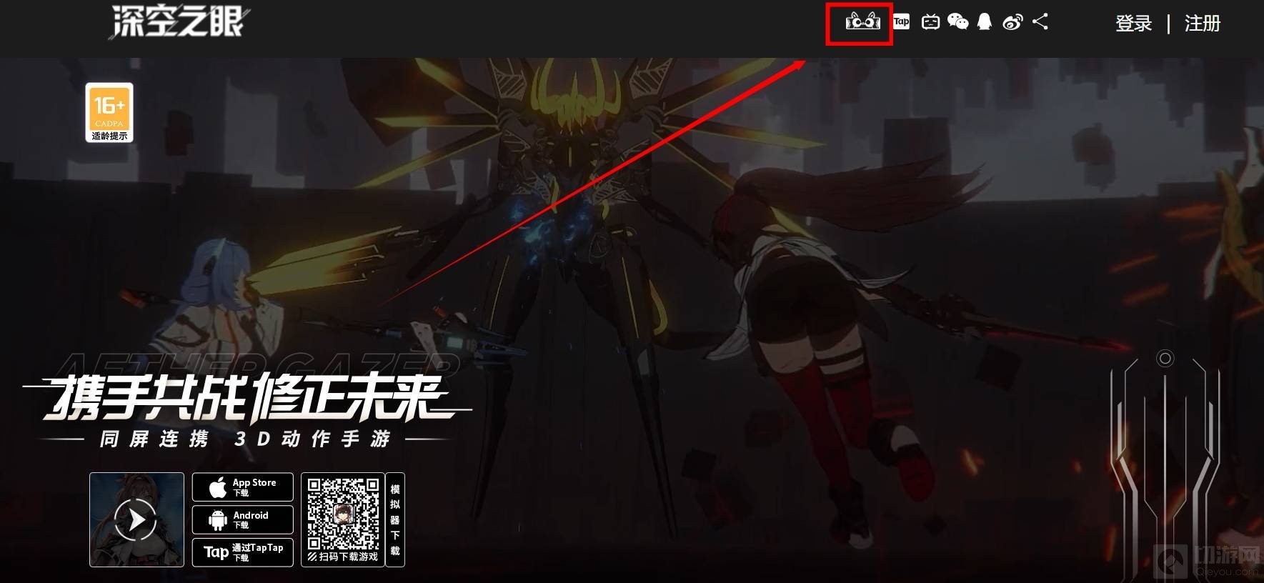 1、先进入深空之眼官网,点击右上角如图标注的图标。