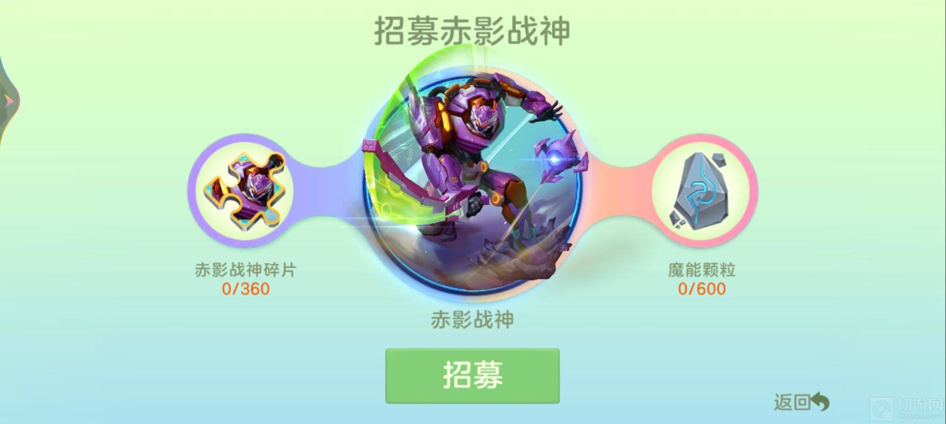 然后选择你要合成的魔灵,比如赤影战神,点击招募,然后消耗,一定数量的赤影战神碎片和魔能颗粒就可以招募了。