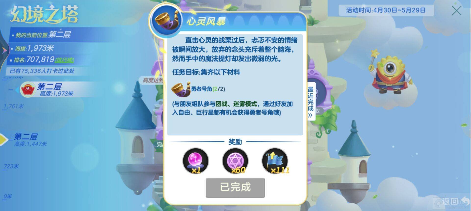 心灵风暴:收集2个勇者号角,在团队,迷雾模式有机会获取,通过好友加入自由,巨行星也有机会获取。
