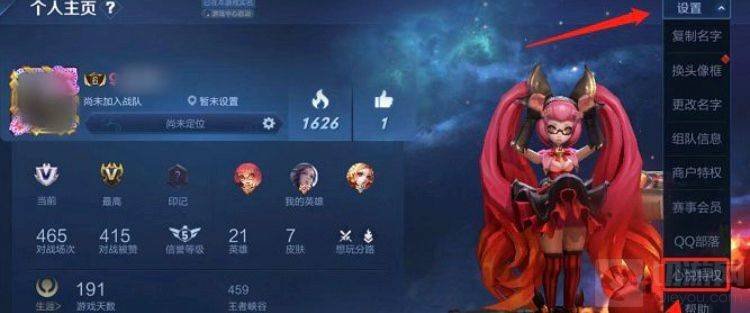 3. 进入到个人游戏主页,点击右侧‘设置’,再往下拉看到‘心悦特权’点击就可选择啦。