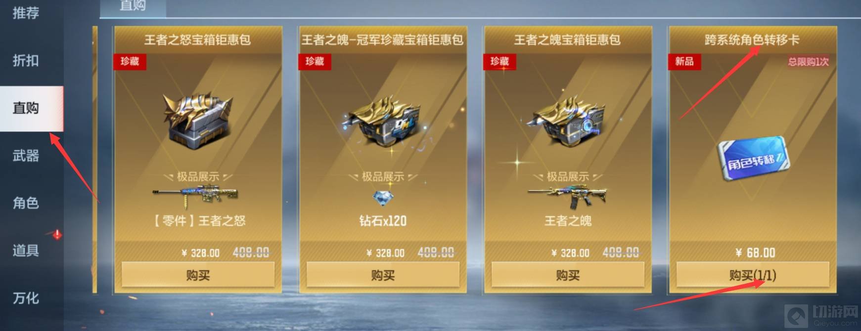 2,点击左边的直购,在最右边找到跨系统角色转移卡,跨系统角色转移卡售价为68元,点击下方的购买即可。