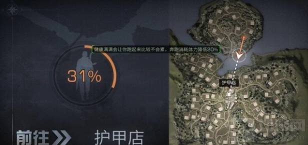 2. 在自己营地的话可以点击小地图,然后在左侧的地图标志上找到护甲店,地图即可显示护甲店的位置,同时在右下角会出现快速前往,点击快速前往即可前往营地的护甲店。