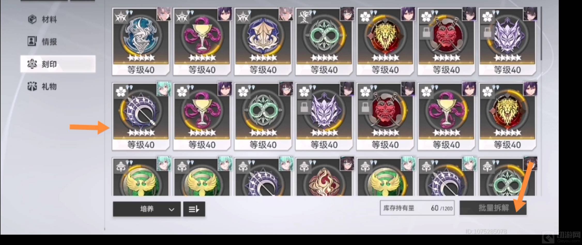 3、进去之后可以选择需要分别的刻印,然后点击批量分解即可。分解刻印会返还突破材料,还可以用于强化。