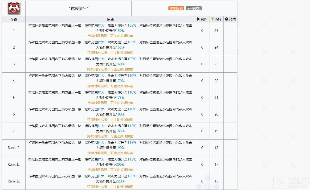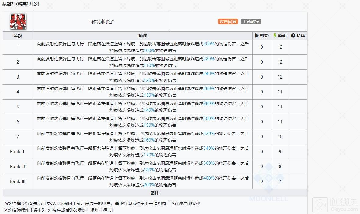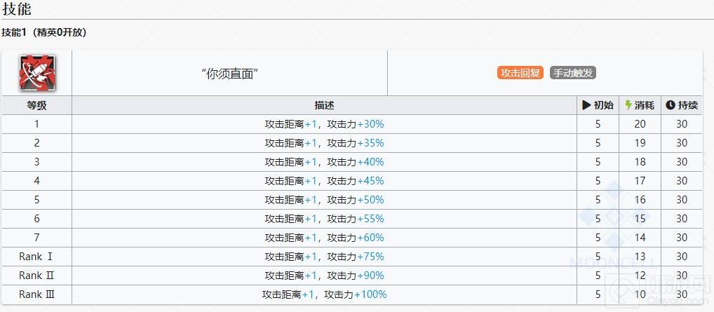 一、一技能"你须直面"因为不存在质变阶段,只是一个持续增加技能期的攻击力,而且从七级到专三的DPS变化是:8.7%、17.5%、23.3%,提升非常中规中矩,所以建议练度:七级,不用专精。