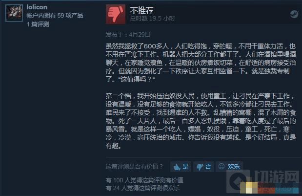 对于这种灵魂拷问,一部分人认为这是游戏厂商比较具有思想深度的内容,值得表扬;另一部分人认为明明是自己这个领导者千辛万苦带领民众走出困境,最后却还要受到道德苛责,未免有些不够恰当。