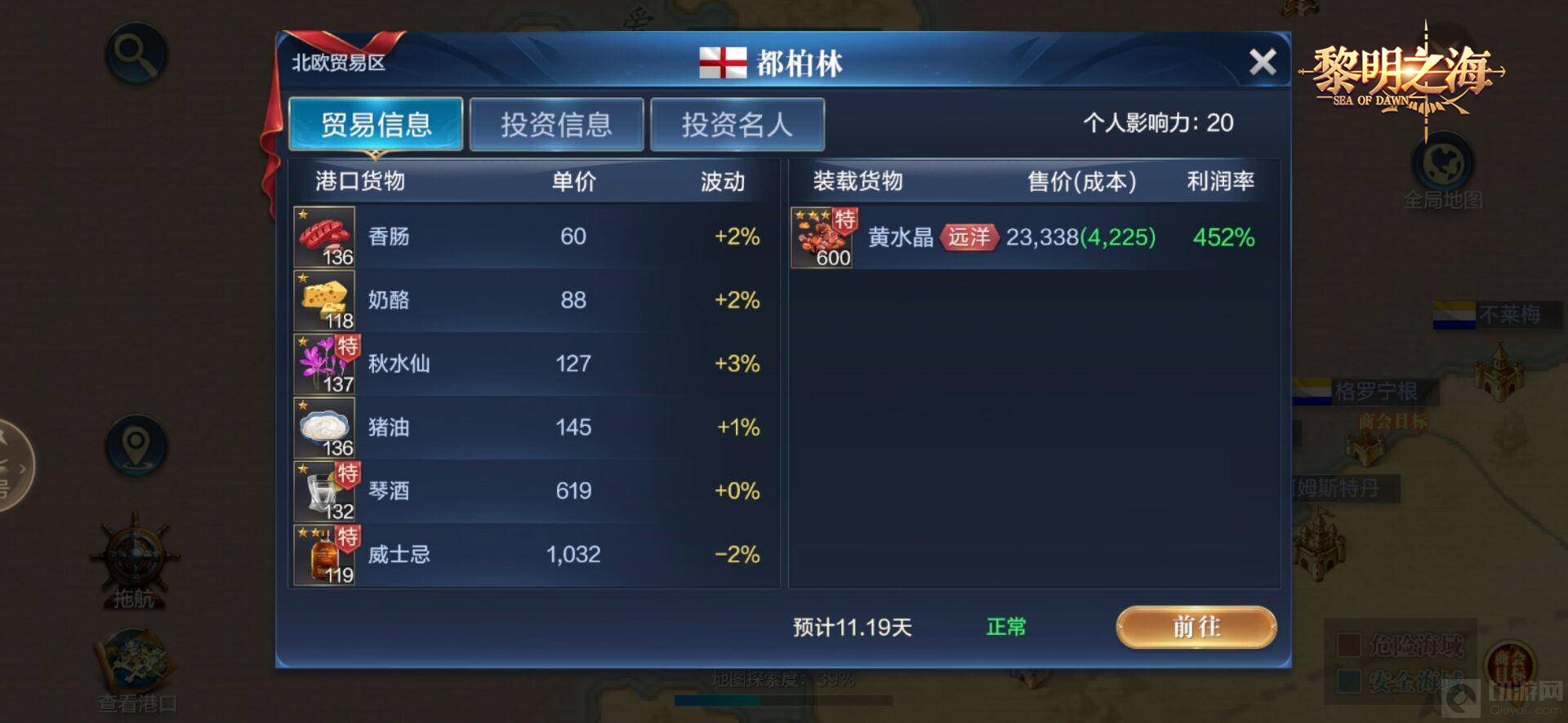 不过,如果能将高级货物到其他海域的港口上出售,利润会远比上面两种方式高得多,这种贸易方式称为远洋贸易。不过,目前远洋贸易每天最多只能进行五次,想要最大化收益,就必须向带有高级货物的港口投资。根据货物的基础价不同,需要投资的贸易额也不同,甚至不同港口之间相同的货物,投资的数量也有所差距!如何在前期用最经济的方式拿到更多货物,充分利用远洋贸易次数,可是玩家在黎明之海中的终身必修课了!