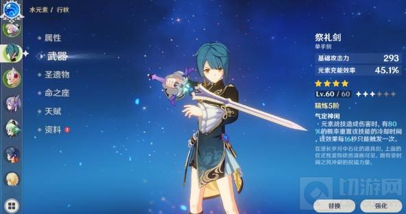 1.武器选择祭礼剑,重置元素战技的被动相当好用,元素充能200%情况下,两次元素战技就能叠满大招。