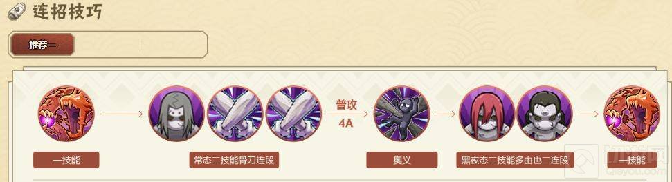 2.二技能直接释放是控制君麻吕往前释放一个突进效果,然后会在二技能图标旁出现两个子技能(追打技),不同的顺序释放这两个技能,会有不同的攻击方式。下面是君麻吕的三种攻击方式。