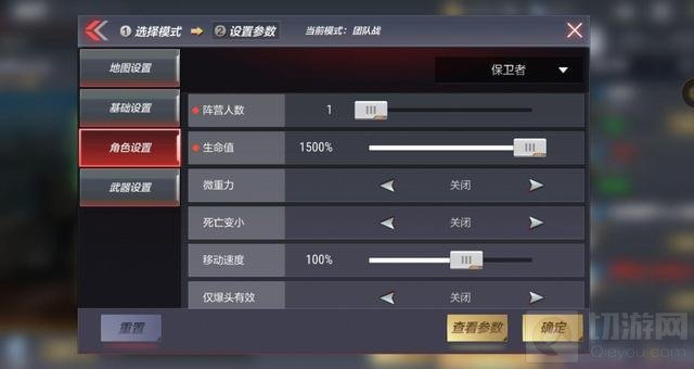 2、然后点击“角色设置”,调整为保卫者一方,将阵营人数调至1,生命值调整到最高,移动速度拉满,击杀回血拉到最大值,死亡复活时间拉到最低。