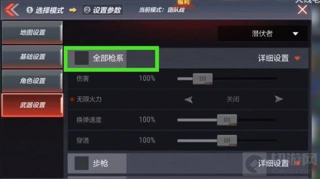 3、接着点击“武器设置”,同样是在保卫方开启“无限火力”,即你拥有无限的子弹数量;之后对潜伏者的改动是关闭全部枪系,这样所有的潜伏就只能拿个小刀了。
