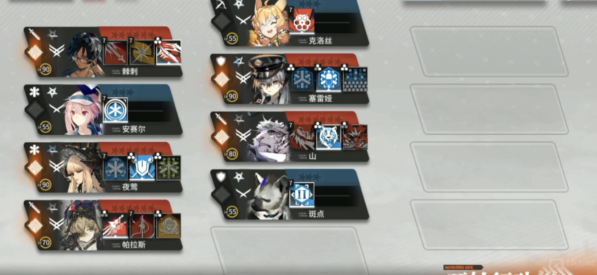 1、队伍选择棘刺,安赛尔,夜莺,帕拉斯,克洛丝,塞雷娅,山,斑点,缺少的干员建议选择借助好友。