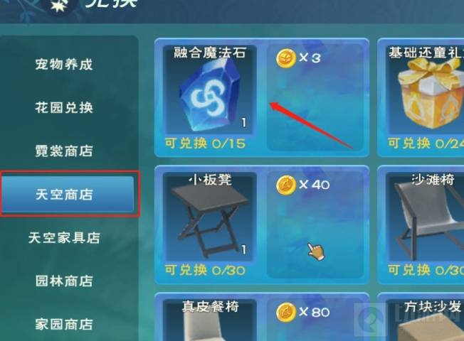 3、再点击打开天空商店,然后点击融合魔法石,商店里边有两个融合魔法石购买选项,第一个红箭头标记的是用天空币购买,右侧没有标记的是用乐园币购买。