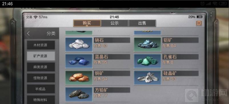 4.点击矿资源之后可以看到很多的矿产资源,在列表内找到硅晶矿,一般位于最底部就是硅晶矿。