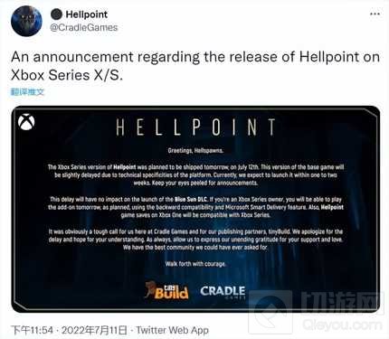 开发商Cradle Games在今年5月确认,旗下科幻动作RPG《地狱时刻》将于7月12日登陆PS5和XSX|S平台。然而计划赶不上变化,虽然PS5版游戏在昨日(7月12日)顺利上线,但是Xbox Series版本的游戏却出了意外。Cradle Games给出的原因是“由于平台的技术特殊性”,XSX/S版《地狱时刻》将延期发售。