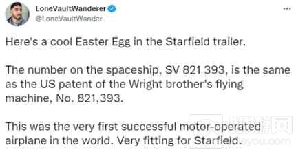 正如推主@LoneVaultWander所写,《星空》宣传片中的飞船上印着的编号SV821393,与莱特兄弟发明的飞行器的专利号No.821393相同。相比获得专利的1906年5月22日,申请专利的1903年3月23日要更有纪念意义。2023年3月23日则正好是该事件的120周年纪念日,以此作为发售日似乎说得通。