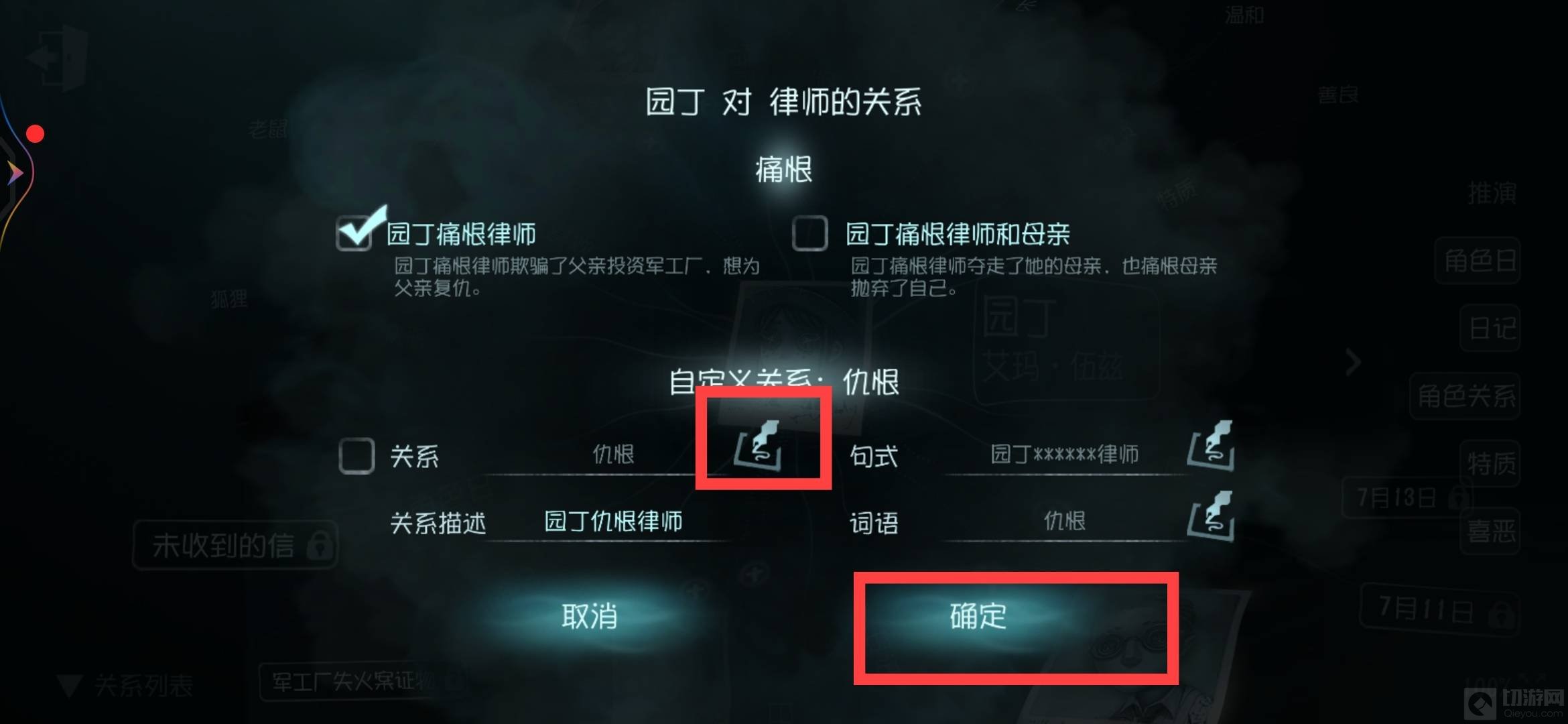 8,确定后,“ ”号就会变成玩家自定的关系,点击就会显示园丁对律师的关系。点击后面的图标可以修改。其他角色之间的关系完成了相对应的推演日记即可填写。