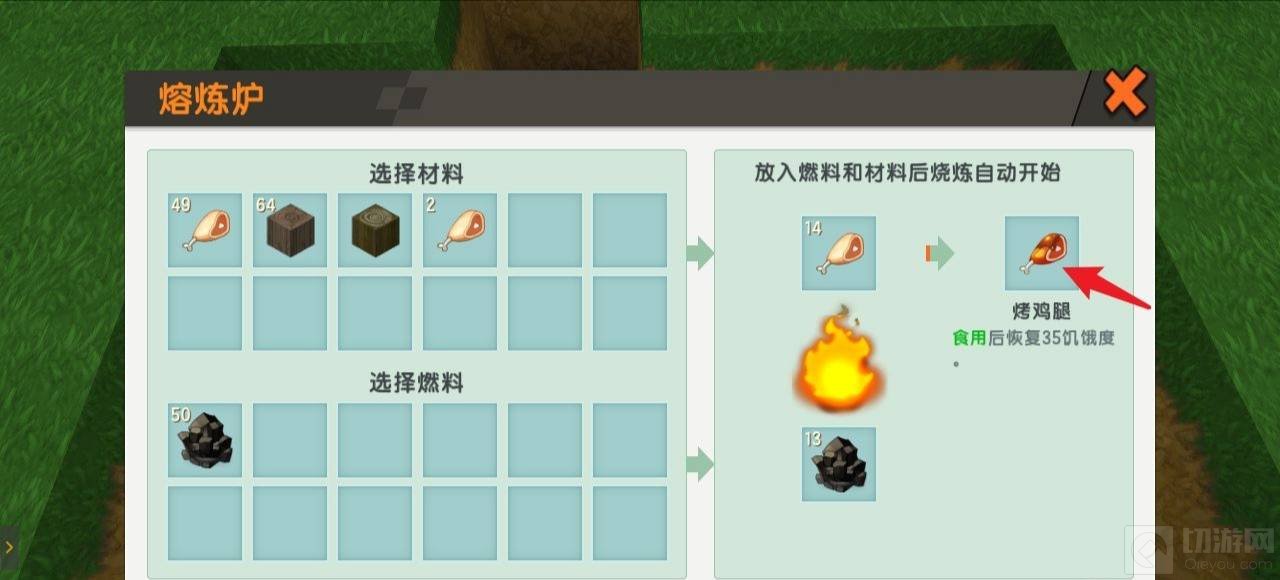 2、打开熔炉,将鸡腿放进去添加燃料,得到熟鸡腿。