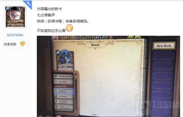 贴吧玩家曝出了一张冒险模式的新卡——德鲁伊职业卡。但这张卡明显不靠谱,身材477,效果抉择or冲锋。如果这张卡是真的,那你让5费64的熊情何以堪。