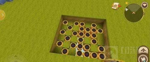 2、然后以螺旋的摆放的方式在石块上面再叠加方块(如图所示),大约摆个几层就可以了。在旁边留出四个方块的空位,然后中间刨坑,方便可以跳过去。