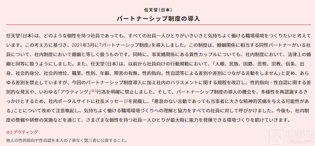 日本任天堂官方实现多样化工作场所介绍一栏更新“伴侣制度”介绍,该制度将“拥有婚姻关系的同性伴侣”以及“有事实婚姻关系的异性伴侣”均视为合法婚姻关系对待,并修订了其员工行为准则,明确禁止出现关于性别、性取向的歧视以及被出柜行为。