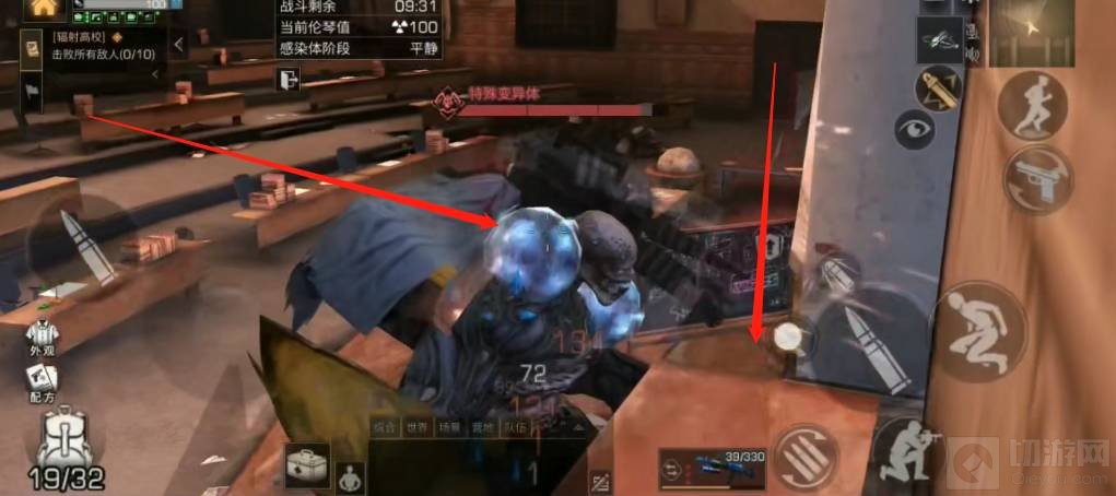 2.在这一层有很多点位可以卡,比如遇到大量感染者时,可以利用桌子来躲避一些伤害。在有特殊感染体时,可以站在比较高的柜子上,这样可以做到无伤打死它。