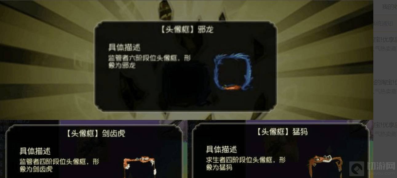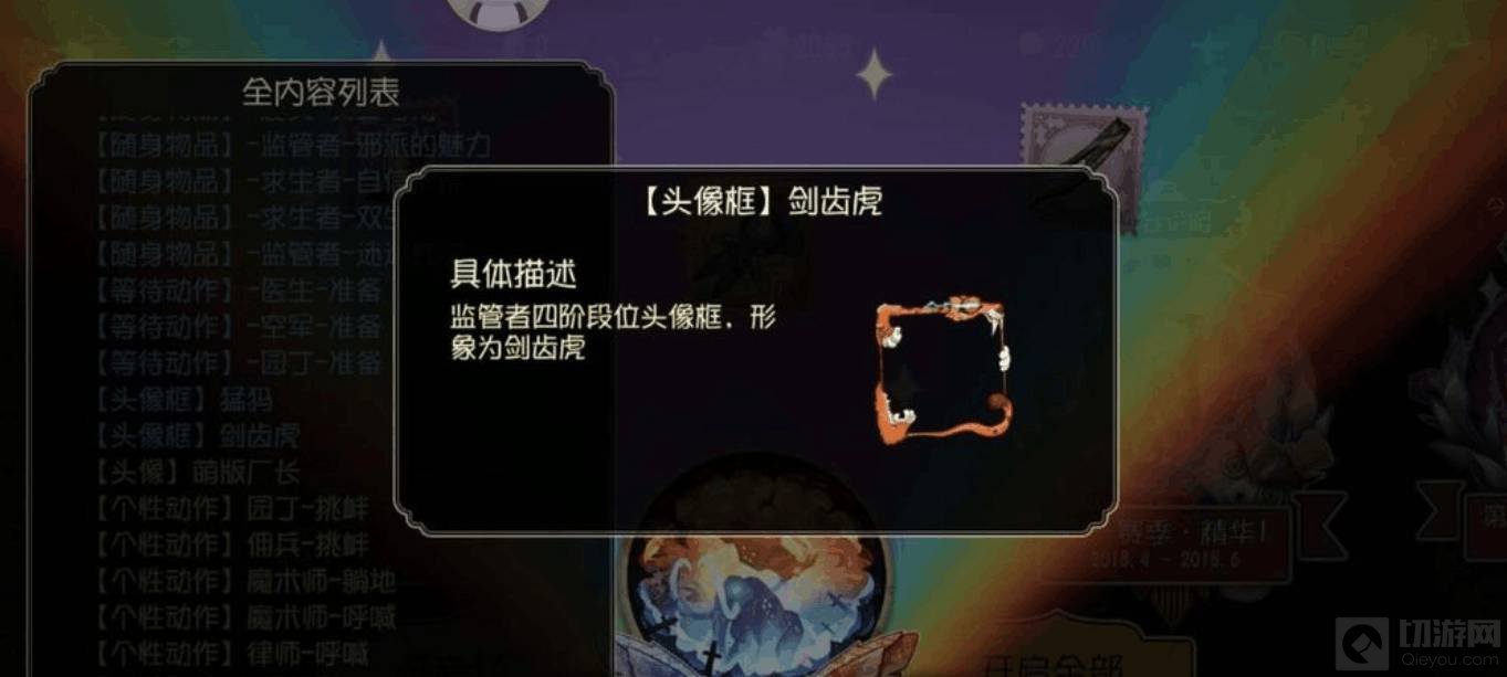 第六步:点击剑齿虎头像框,此时将弹出头像框剑齿虎具体描述,提示需要达到监管者四阶段位才能获得该头像框。