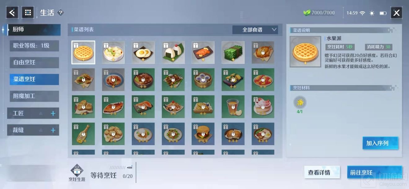 而诺亚之心的厨子升级需要熟练度,需要大量的自由烹饪、烹饪、附魔、材料、家具等技能来获取熟练度,并且在制作的时候需要消耗一定的精力值,并且每天都会恢复1000点能量。