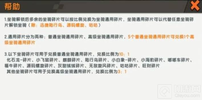 2、小飞鼠、化石龙、麒麟、陆行鸟、小海豹、小白象、嘟嘟车、福运哞哞、源码螺旋、无敌旋风、灰甜绒绒、旺财和咕咕的碎片都能以10:1的比例兑换成普通坐骑通用碎片。而其他的坐骑碎片则能以3:1的比例兑换成高级坐骑通用碎片。用5个普通坐骑通用碎片才能兑换1个高级坐骑通用碎片。