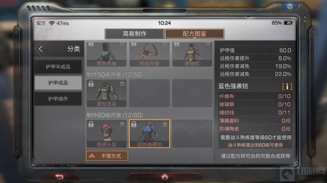 2. 营地装备制作台也可以制作护甲,制作台制作配方:木头400个、铁矿10个。作用:可以在家中制作护甲、武器等,必须建造在地板上,每个建筑内只有1个制作台能够制作。