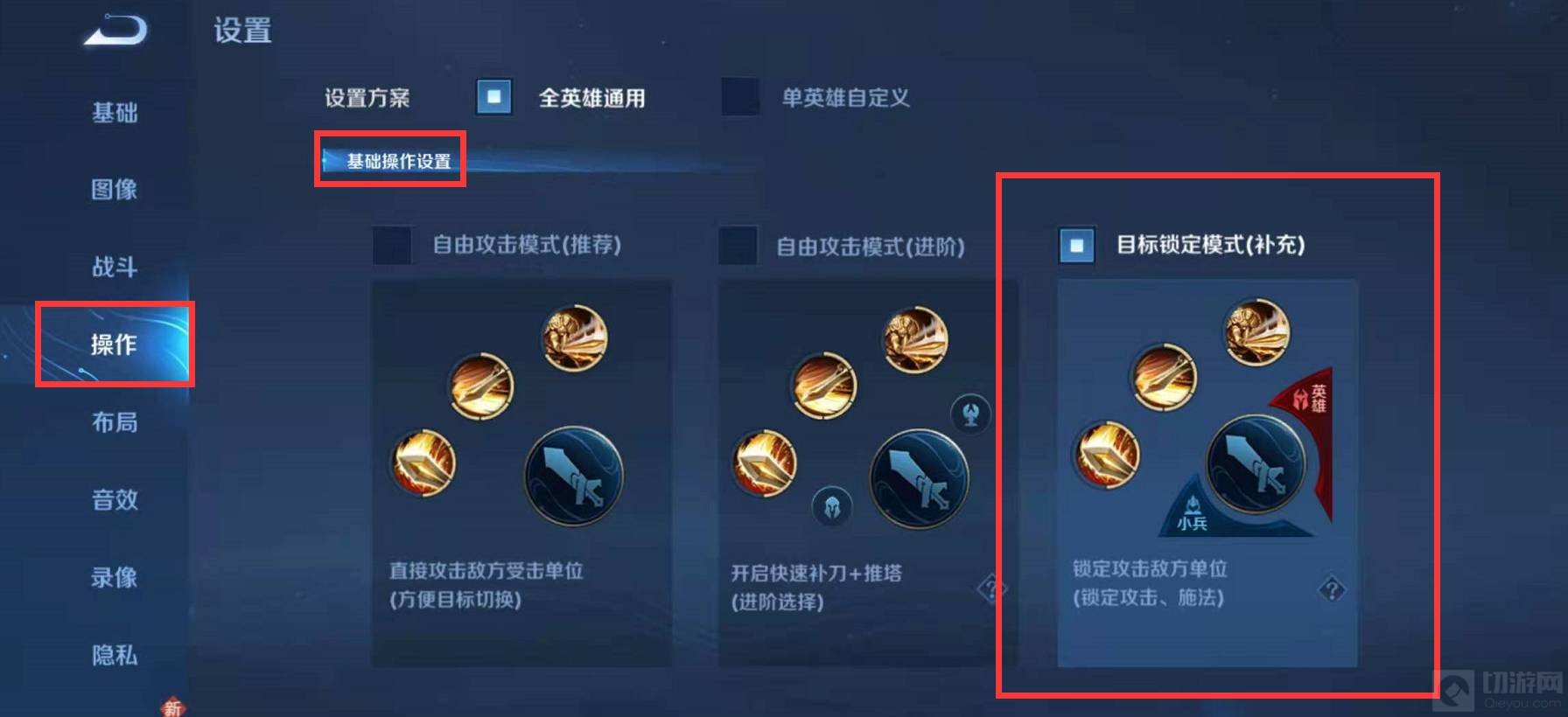 2.在设置界面,点击左侧导航栏中的'操作”,然后在基础操作设置中选中“目标锁定模式”,就能在游戏时就能锁定敌方进行攻击了。