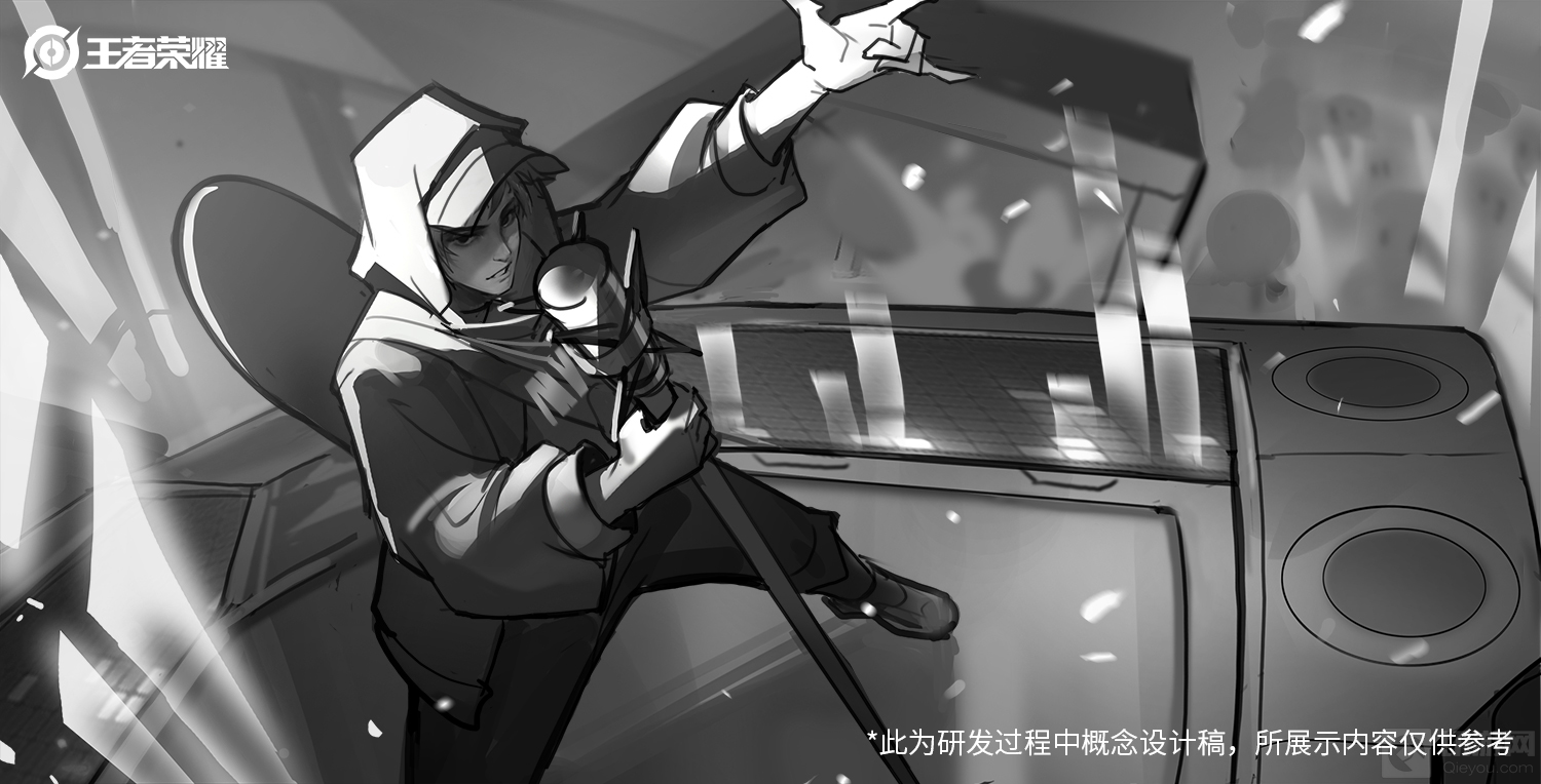 “准备好了吗?”他站定在舞台,举起麦克风,又引起新一轮的尖叫。此刻,他专注于当下,全场炸裂,高潮已至。该方案尝试了新的构图及动作,侧重表现角色热爱嘻哈、真实沉浸的一面。